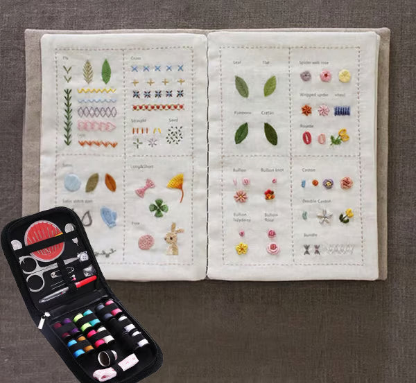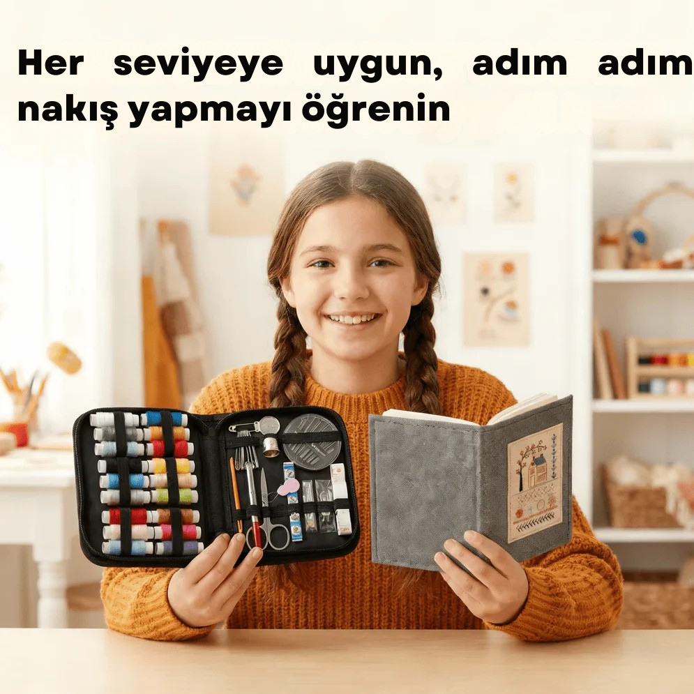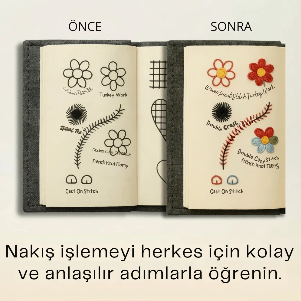 - 1 adet El Yapımı Kumaş Sayfalı Nakış Kitabı: Yüksek kaliteli kumaştan yapılmış 20 sayfa ve 60'tan fazla önceden basılmış desen içerir.